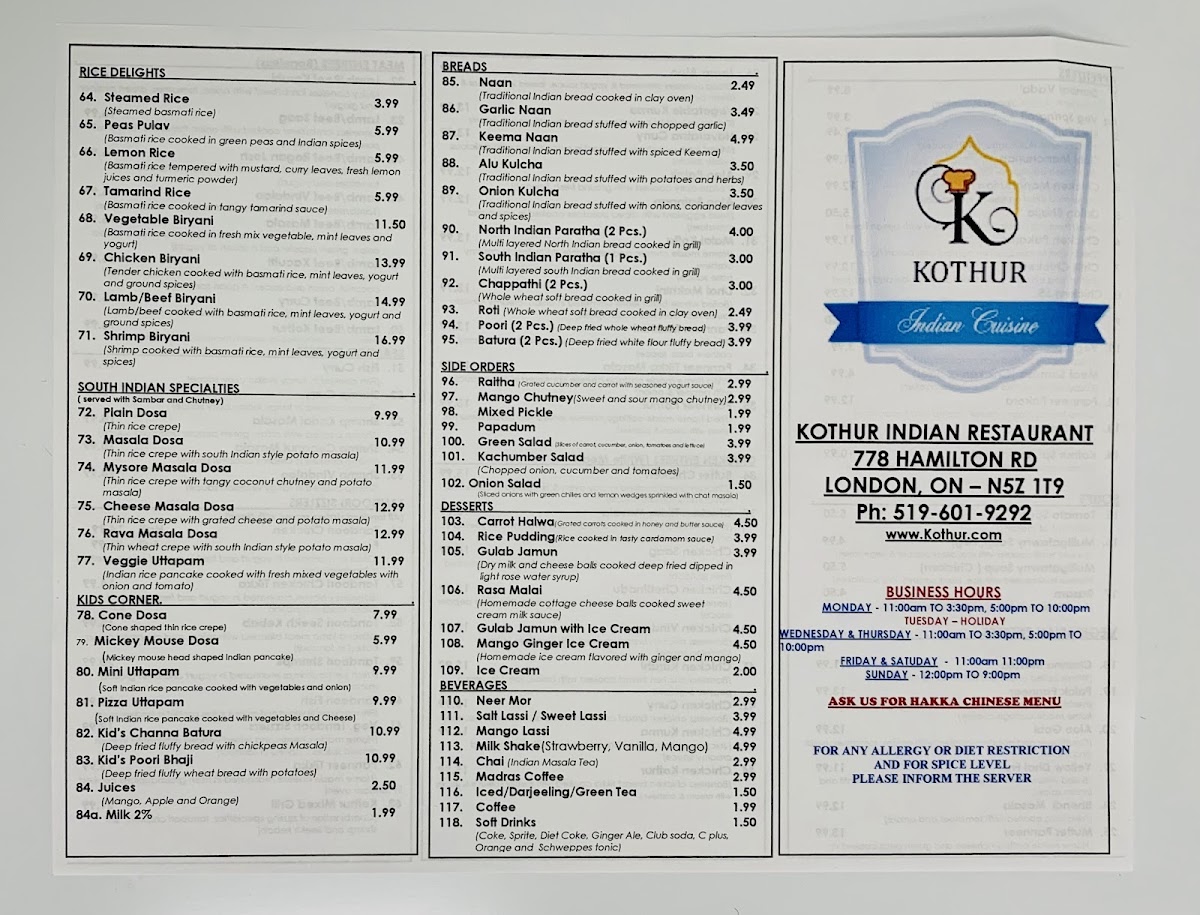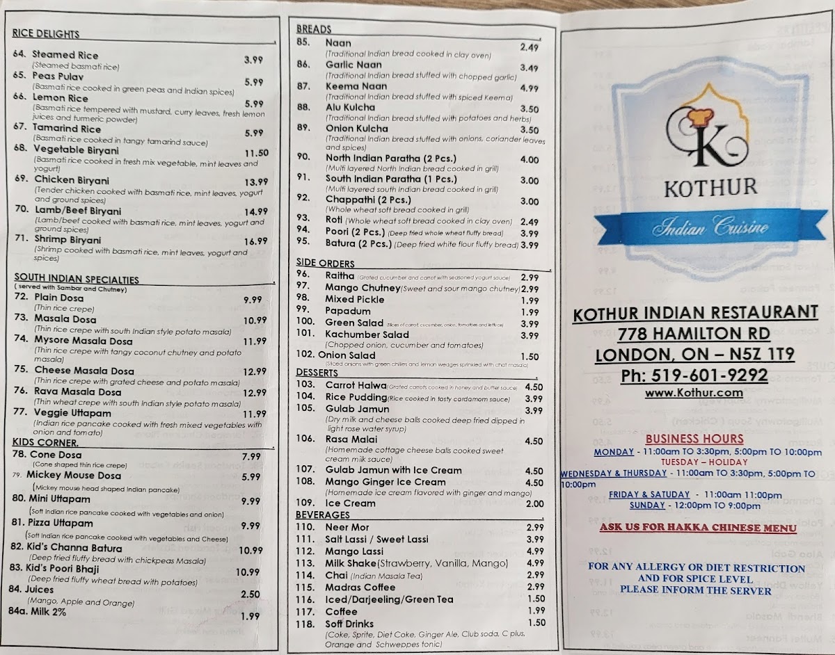 If you're in London, Ontario, and yearning for a taste of authentic Indian cuisine, look no further than Kothur Indian Cuisine. Nestled at 778 Hamilton Rd, this charming restaurant offers an enticing array of dishes steeped in rich flavors and spices typical of the Indian subcontinent. A true gem for any food enthusiast, Kothur has garnered rave reviews for its delicious food, warm ambiance, and attentive service.